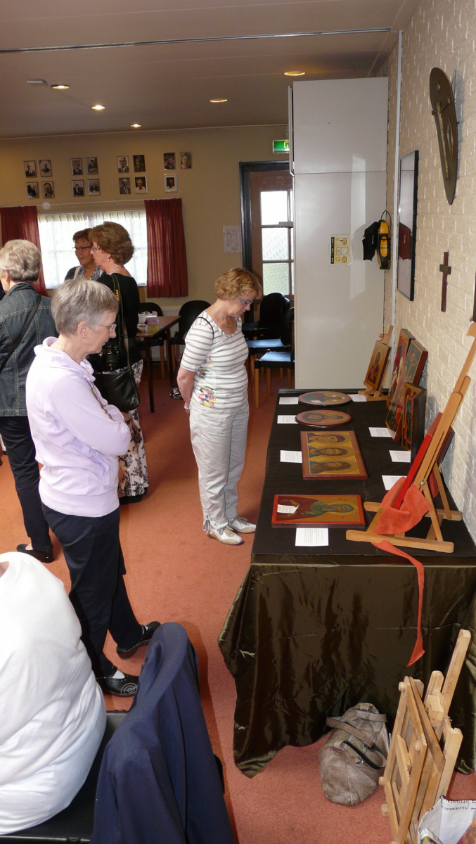 Open monumentendag 31 augustus 2013 Uitgenodigd door de Gereformeerde kerk in Loosdrecht hebben Anja en Monica een tentoonstelling gehouden van ikonen en een demonstratie gegeven van het schilderen van ikonen. Er was veel belangstelling vanuit de gemeenschap. Geïnteresseerde voor de tafel met ikonen Image 6 of 8
